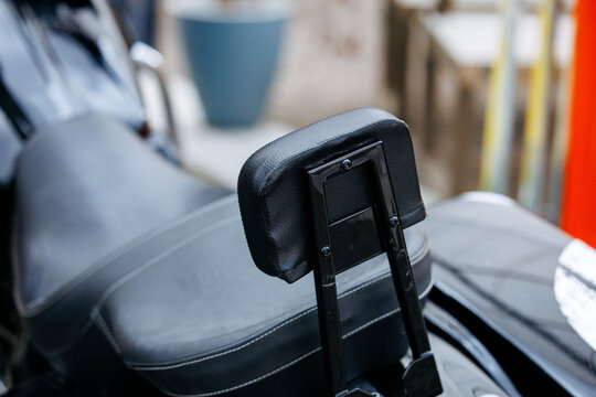 Black leather motorcycle seat with backrest on outdoor motorbike