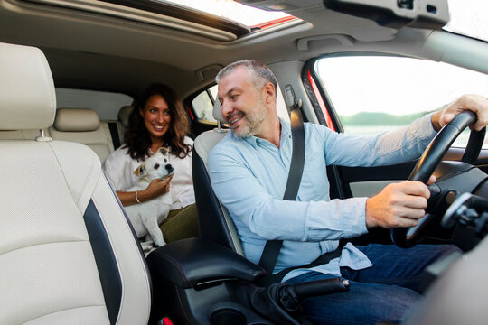 Pet friendly taxi service concept. Cheerful man driver talking with woman, riding car, lady sitting in backseat with her dog