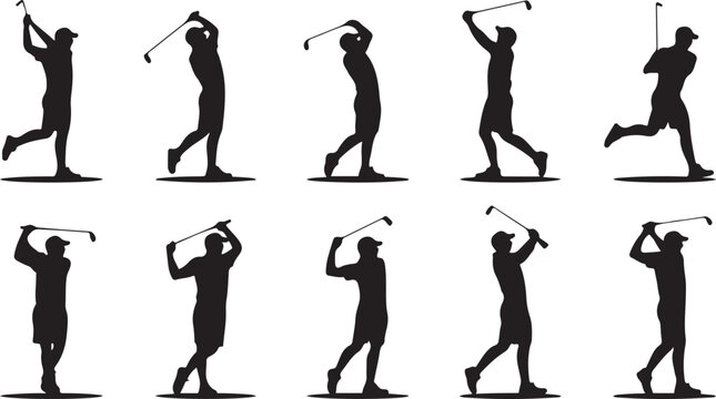 Collection of golf player silhouettes showing various dynamic swing poses for sports and recreation graphics