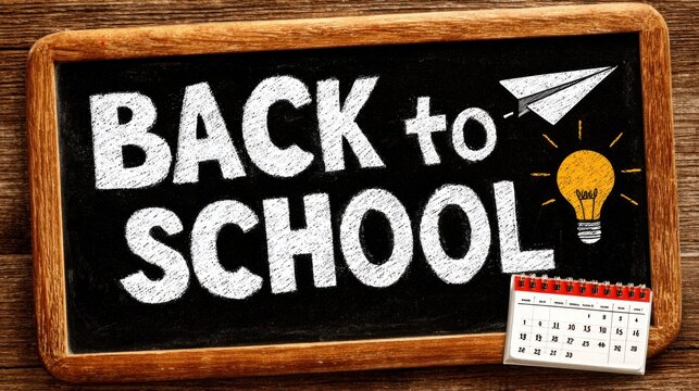 Cartoon-style blackboard with “Back to School” text, featuring a paper airplane outline, light bulb icon, and a calendar in front, yellow or pastel background, clean vector illustration