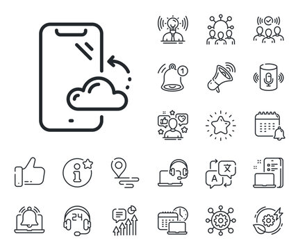 Phone backup sign. Place location, technology and smart speaker outline icons. Smartphone cloud line icon. Mobile device symbol. Smartphone cloud line sign. Influencer, brand ambassador icon. Vector