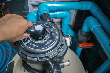 Clear the sand filter of the pool.Service and maintenance of the pool.Black wash filter tank of the pool.