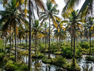 High-angle of coconut plantation canal backwater karela India