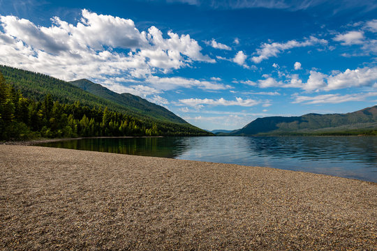 Beaver Meadows lake in Allegheny National Forest. Pine and evergreen trees line the shoreline with grass. It is a blue sky, with a few white clouds.