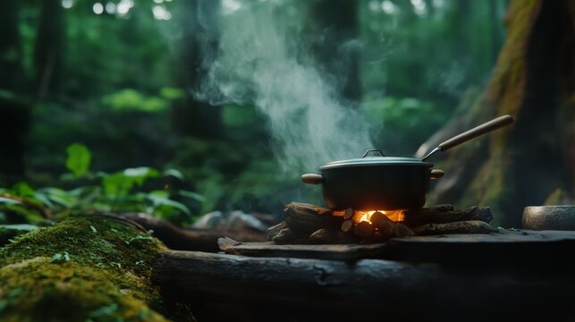 primitive cooking setup, wild environment, moss and roots, backwoods style