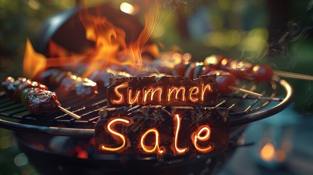 A summer sale sign is displayed on a barbecue grill with skewers of meat and vegetables in the background.