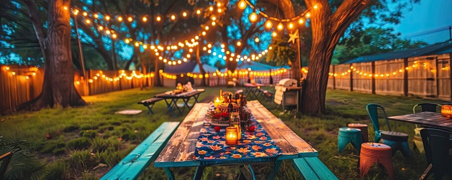 Watercolor depicting a classic American backyard barbecue party setup  with grilled food  American flags  and festive like banners  bunting  and stars and stripes