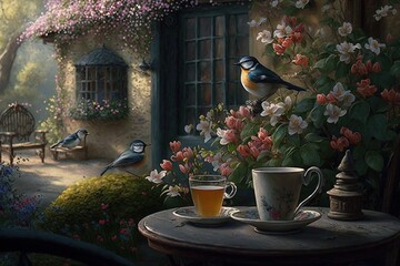 a painting of a bird sitting on a table next to a cup of tea and a bird on a chair in front of a house.  generative ai