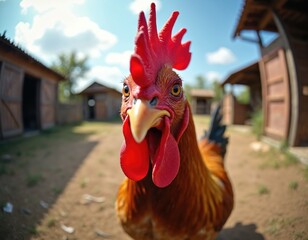 Close-up portrait of rooster looking at camera with fisheye lens. Domestic bird has bright red comb, brown feathers. Funny curious cockerel peeking on farm backyard in summer.