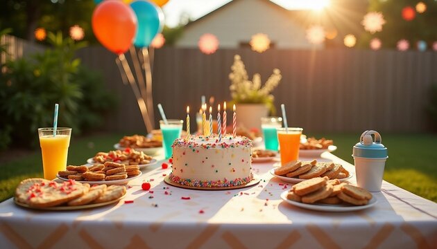 A picturesque backyard with a long table set for a children's birthday, featuring a frosted cake, drinks, and snacks.