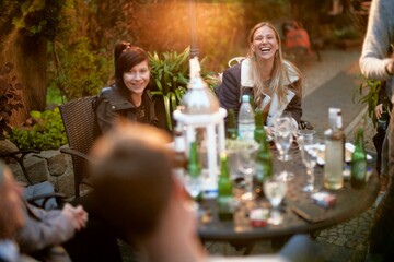 friends at table full of bottles of garden party