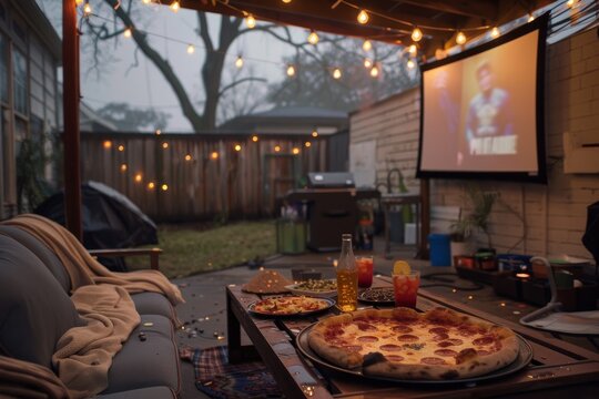 Pathway illuminated by string lights creates magical atmosphere in green garden at dusk. Twinkling fairy lights invite to romantic evening stroll, summer party, backyard gathering, rustic ambiance.
