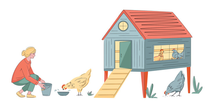 Focused woman feeding domestic chickens in small henhouse on family homestead