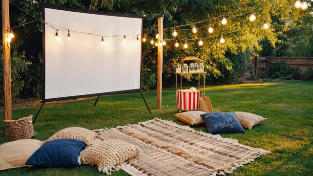 A spacious backyard is transformed for a night of outdoor entertainment, showcasing a large screen, glowing string lights, and a warm fire pit ambiance