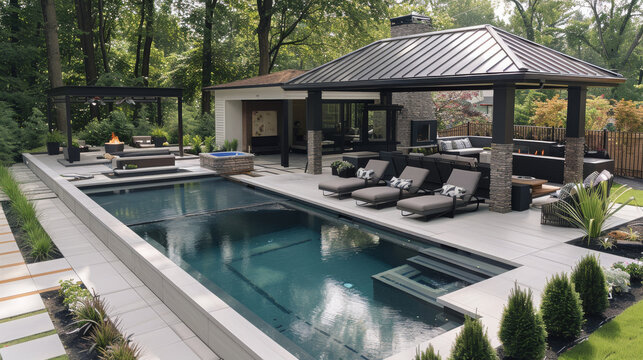 A stunning modern backyard with pristine landscaping, beautiful designed beds, modern grill, gazebo and modern fire pit, beautiful pool. Generative AI.