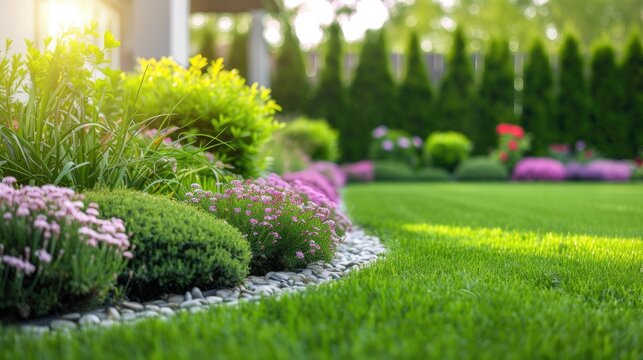 Manicured lawn and vibrant flowerbeds in a sunny backyard oasis
