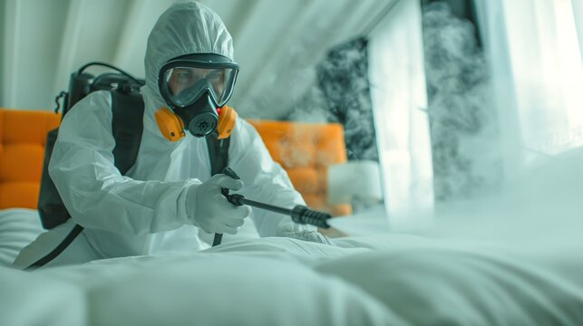 Pro worker in protective suit, mask sprays disinfectant inside room. Technician cleans hotel home bedroom, targets pests, insects, rodents, bacteria, mold. Service ensures hygiene, safety, health for