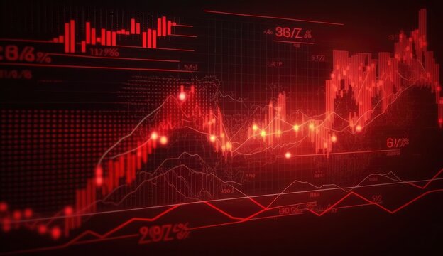 Stock market trading graph in red color as economy 3D illustration background. Trading trends and economic development.