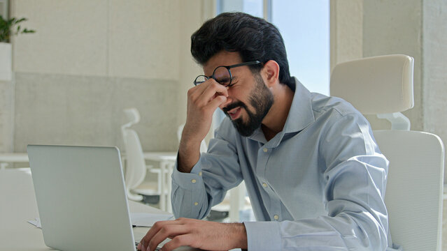 Arabian Indian man tired exhausted worker manager working laptop computer sick businessman rubbing dry itchy eyes male business employer overwork in office take off glasses feel headache bad vision