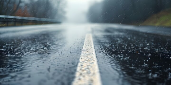 Wet slippery highway in bad weather shows dangers of driving in rain. Concept Driving Safety, Wet Roads, Weather Hazards, Slippery Surfaces, Road Accidents