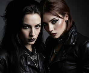 Two gothic women posing in dark environment. Females in leather jackets with theatrical make-up. Dark lipstick, eyeliner, chokers emphasize gothic subculture style. Mysterious artistic photo for