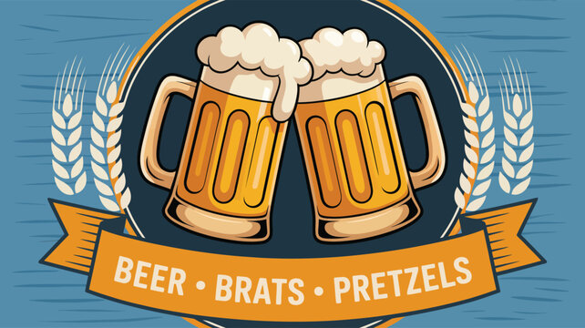 beer mugs clinking with foam and wheat stalks in circular design, banner text beer brats pretzels for oktoberfest celebration theme