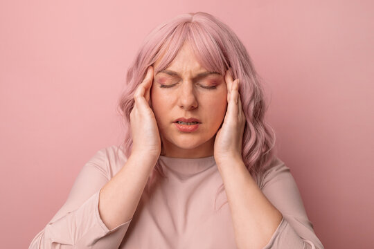 Handsome 30s woman feeling stressed over pink background. Suffering migraine. Stress, irritation factors, housekeeping, overwork, badmood