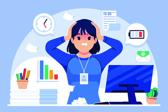 Flat vector illustration of woman with open mouth, clutching at head with both hands. She suffers from headache, panic, fright, depression. Stress, irritation factors, housekeeping, overwork, badmood