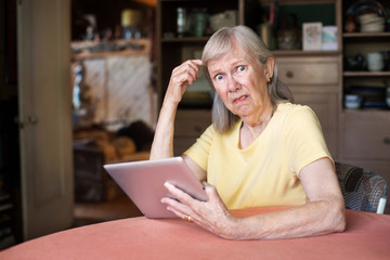 A confused businesswoman stands in front of her computer, surrounded by books and pens, seeking solutions for a marketing campaign landing page design.