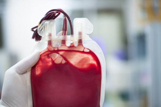 Close up red blood bag in laboratory.