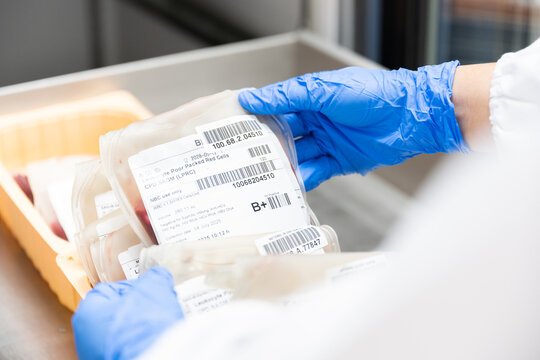 A medical professional, seen from the torso down and wearing a white lab coat and blue sterile gloves, is carefully handling a blood transfusion bag filled with red fluid, placing or adjusting
