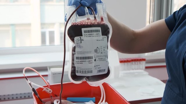 A nurse is holding plastic bag with blood of donors. Blood package sample. Blood transfusion and donation concept 4k
