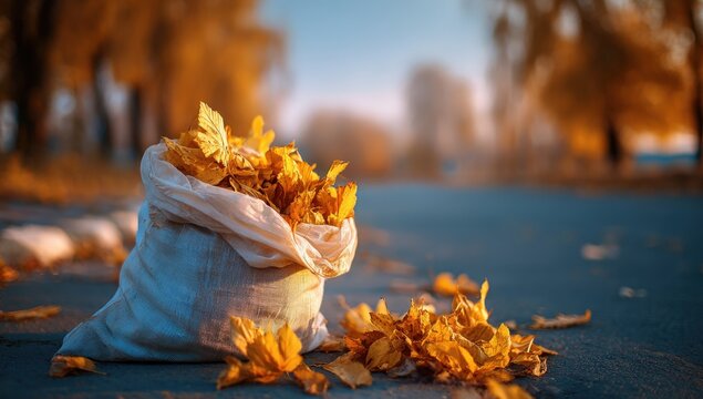 Autumn leaves in a bag on a road