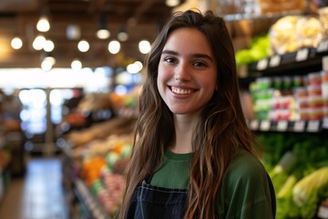 Smiling Woman in Green Shirt and Jeans in a Grocery Store Generative AI