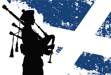 Silhouette of a bagpiper with Scottish flag on the background