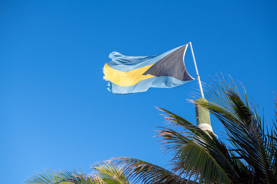 Bahamas Flag Flying Against Blue Sky with Palm Trees