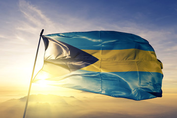 Bahamas Bahamian flag textile cloth fabric waving on the top sunrise mist fog