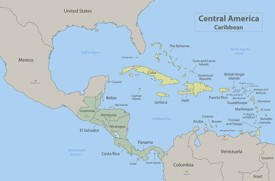Hand drawn vector map of Central America and Mexico. Colorful cartoon style cartography of central America including Mexico, Nicaragua, Honduras, Panama, San Salvador, Guatemala, Bahamas, Cuba...