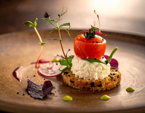 Gourmet appetizer tomato cheese and cracker on a brown plate