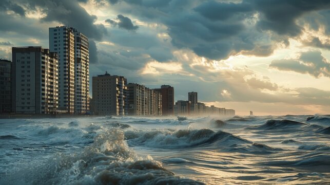 A coastal city at risk of flooding due to rising sea levels, illustrating the imminent threat posed by climate change to vulnerable coastal communities.