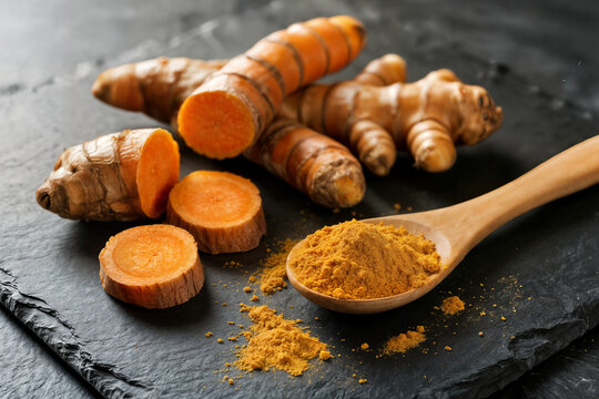 turmeric powder healthy spice food closeup concept turmeric roots sliced wooden bailer rustic dark grey kitchen board azafrán en polvo especia saludable primer plano curcuma zerdecal