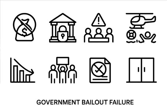 Government Bailout Icons. Outline icon set of government bailout failure: rejected funds, closed bank, emergency meeting, failed rescue, economic collapse,