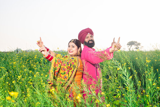 Happy indian sikh couple enjoy punjabi bhangra dance in agriculture field celebrating Baisakhi or lohri festival together, Culture of india. people of punjab.