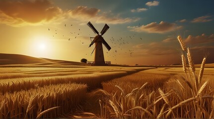 a bowl of grain on a field with ears of wheat the backdrop of a beautiful sunset, a symbol the Baisakhi holiday