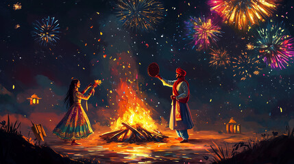Lohri Festival banner showing illustration of a couple wearing traditional Punjabi attire dancing around a bonfire, Ai generated images