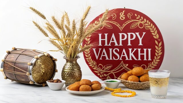 Traditional Vaisakhi festival celebration with sweets, dhol, wheat, and festive decorations.