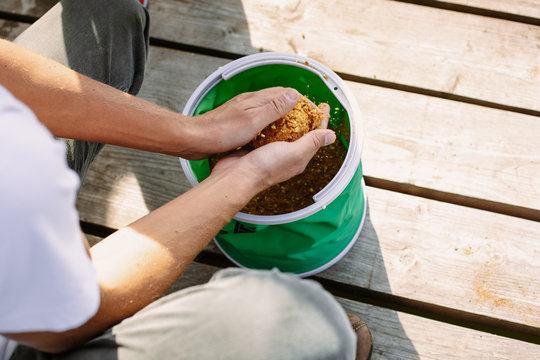 A man takes fish groundbait from a green bag. Close up. Selective focus.