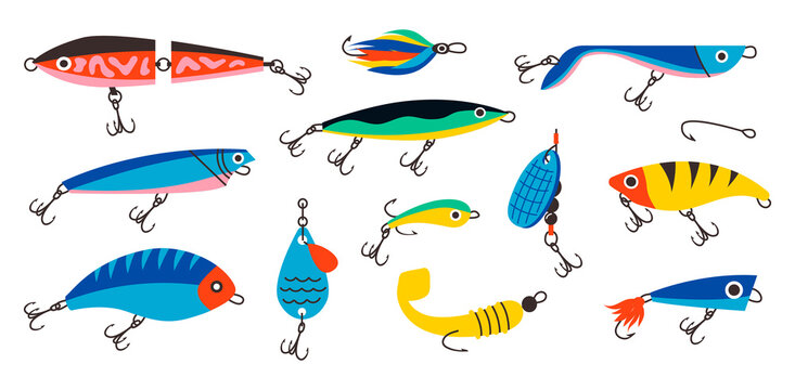 Fishing bait. Abstract contemporary fishery lures and wobblers. Spoons and twisters of artificial colorful fish shapes with hooks. Fisher accessories. Vector fisherman equipment set