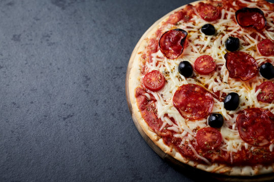 Pizza with chorizo, mozzarella cheese, cherry tomatoes, black olives and oregano. Home made food. Concept for a tasty and hearty meal. Dart stone background. Close up. Copy space.