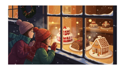 Dreamy Winter Bakery: Two young girls, bundled in winter attire, gaze longingly into a warmly lit bakery window, their eyes alight with the magic of holiday treats.